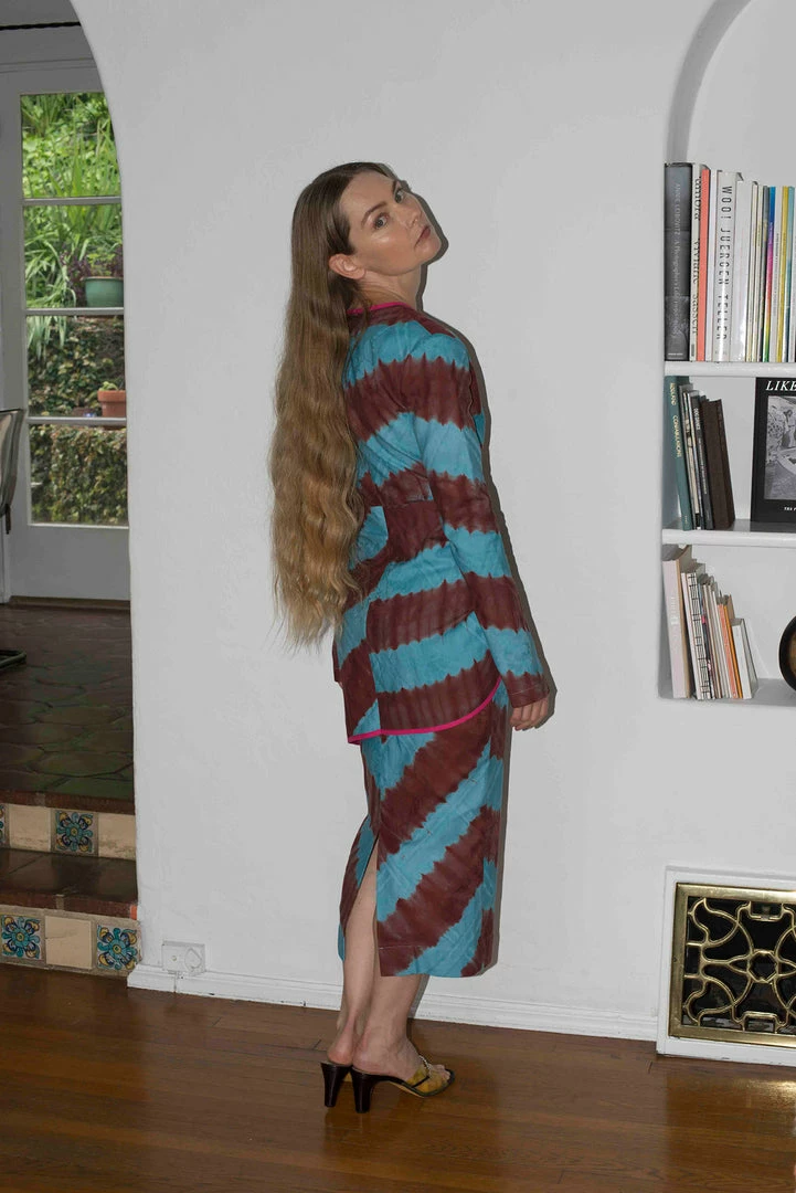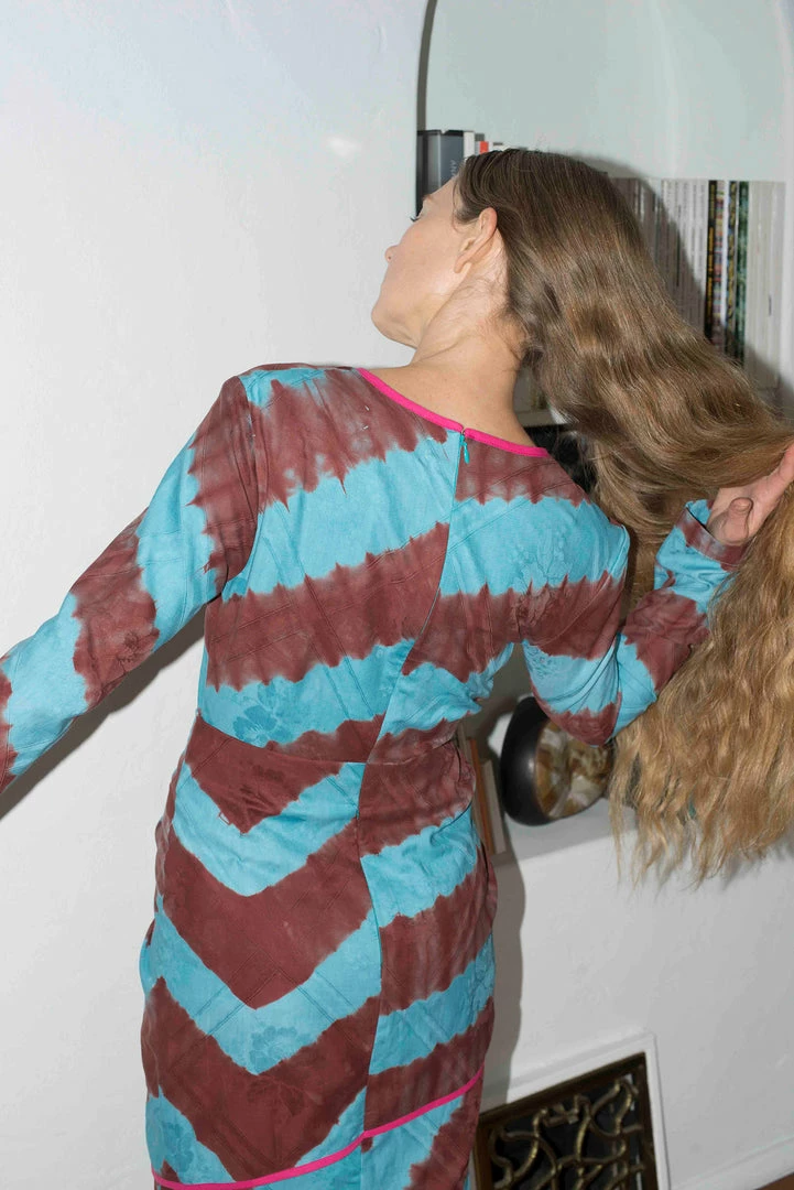 - Midi length, long sleeve tie dyed cotton dress hand dyed in Ghana