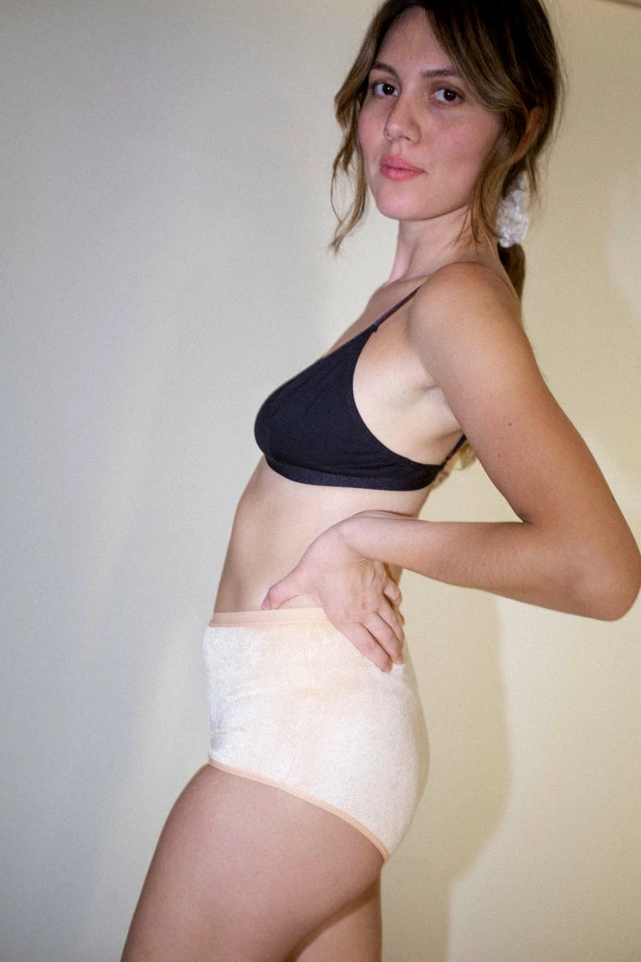 - Shiny velour underwear with a high-waist and elastic trim at waist and leg