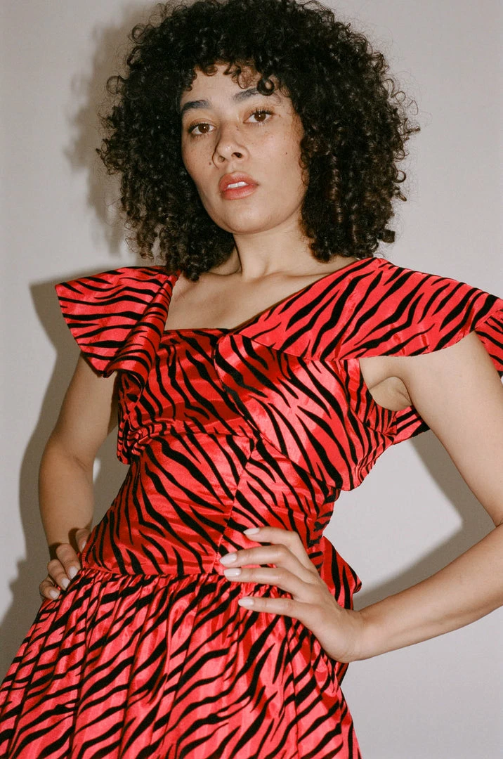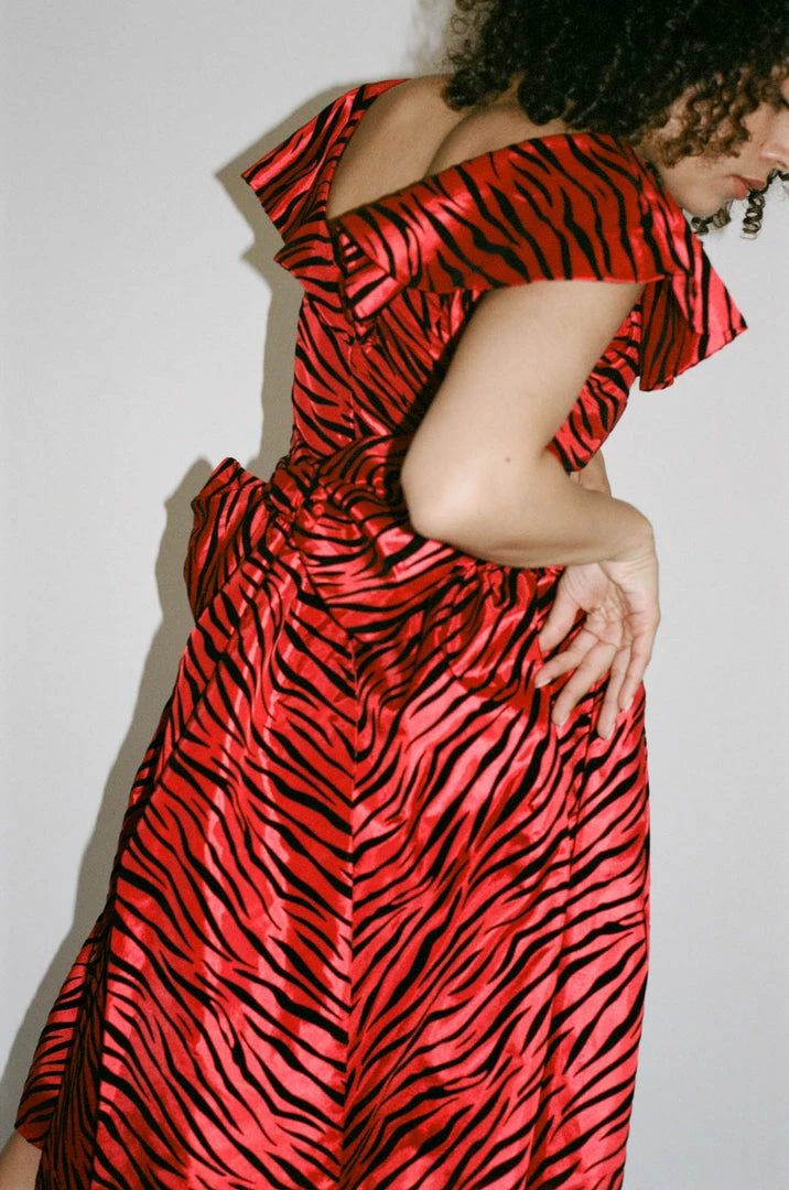 - 80’s inspired dress with big statement flutter sleeves, this fitted dress features a square neckline, large bow at the back waist and a below the knee length.Β Gorgeous red taffeta with black velvet zebra stripes.