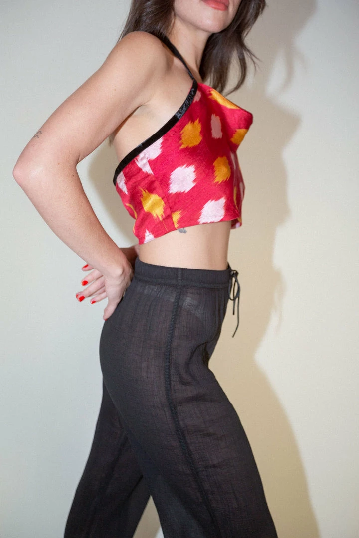 STRAPLESS COWL CROP TOP WITH HIDDEN SIDE ZIP. BLACK VELVET TIES CAN EITHER BE TIED AROUND THE NECK TO TURN INTO A HALTER, OR IN A BOW WITH A SMALL KEY CUT OUT IN THE FRONT FOR A COMPLETELY STRAPLESS LOOK.