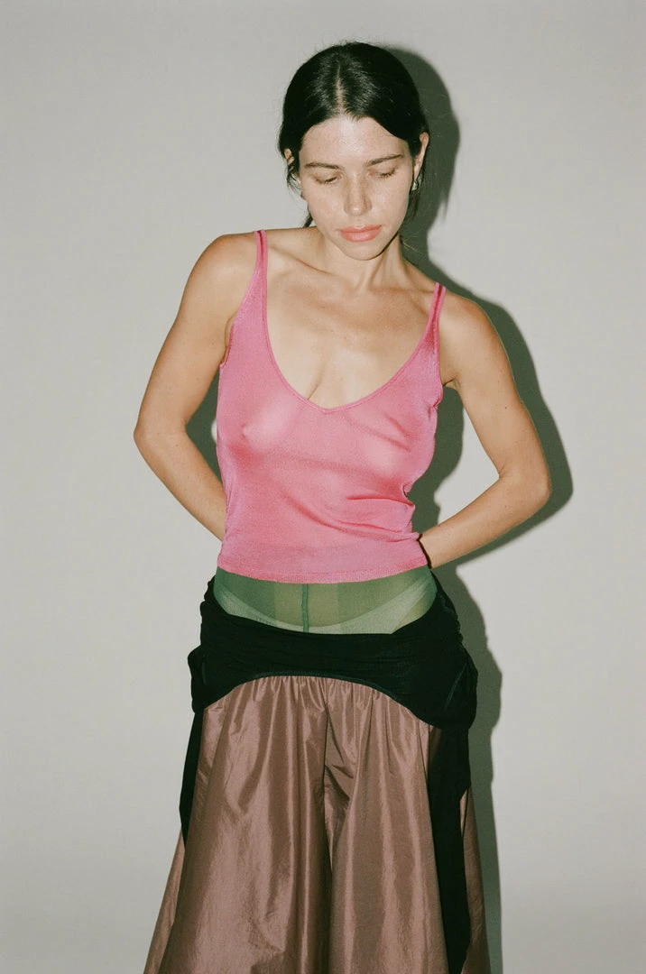 - SlightlyΒ sheer knit tank with V neck detail at the front and back.Β Cropped fit.