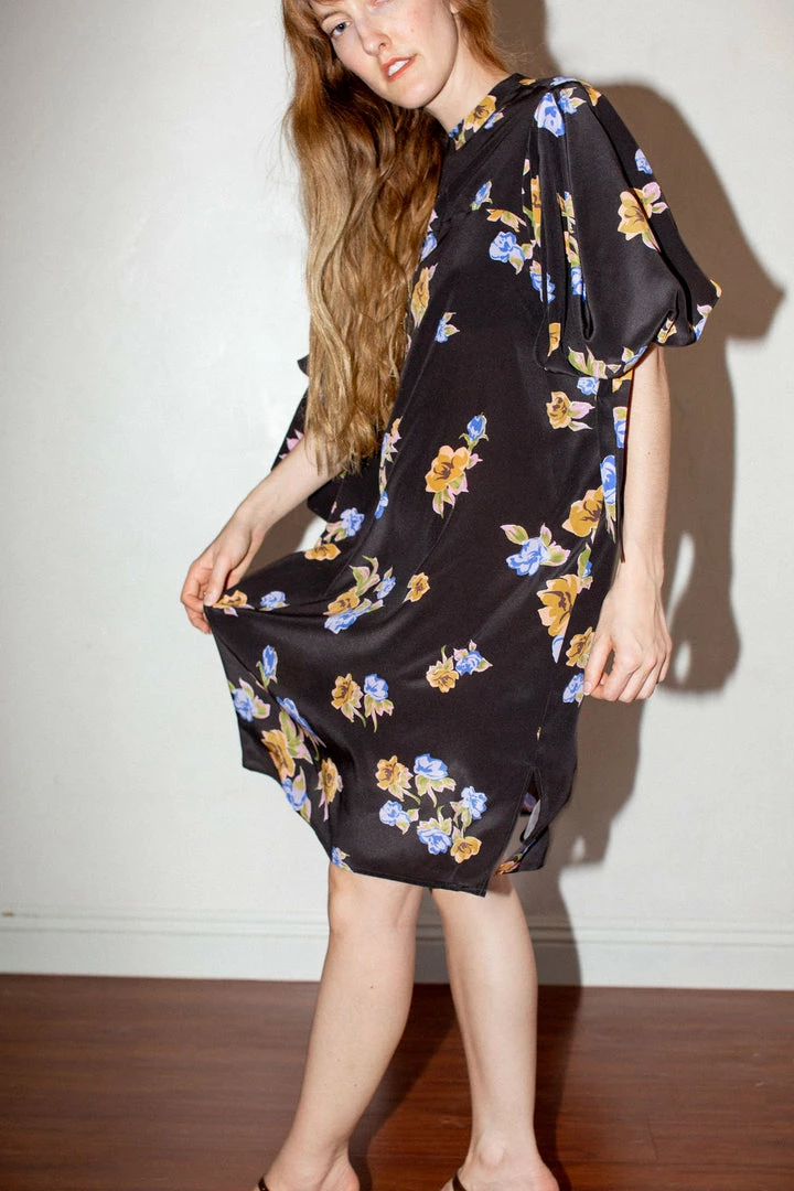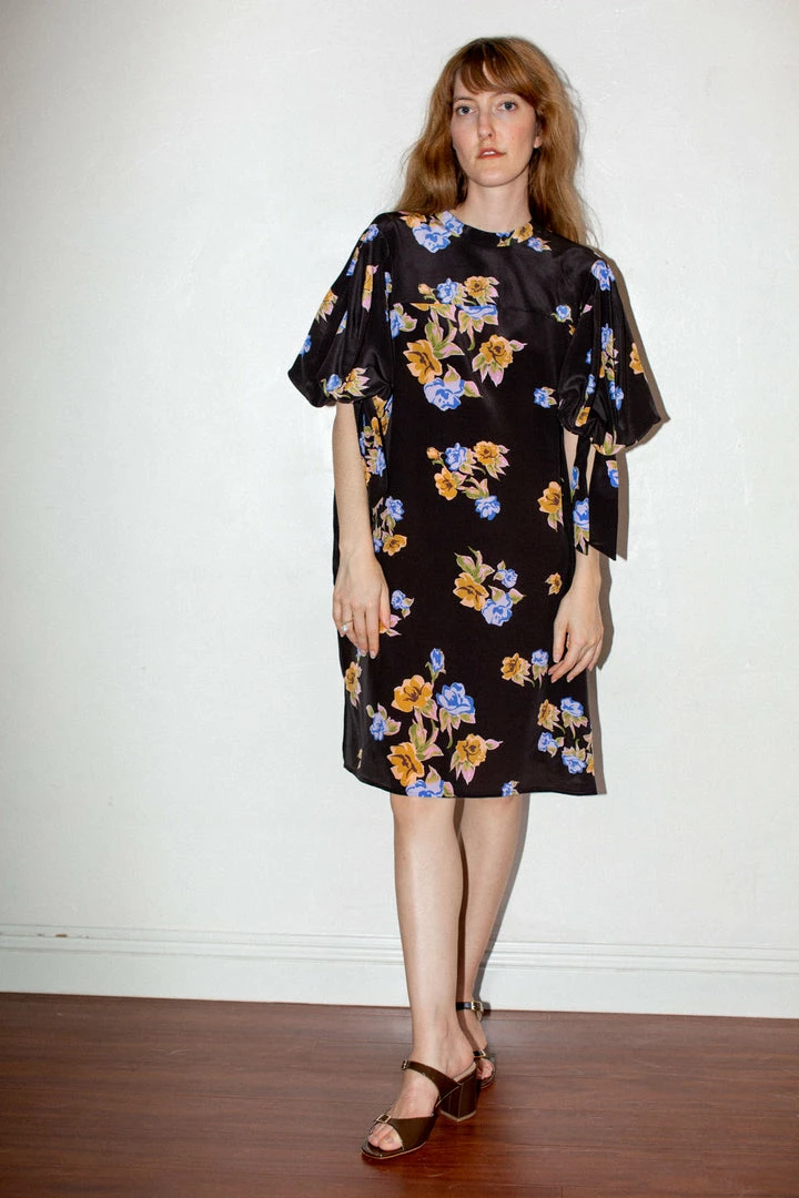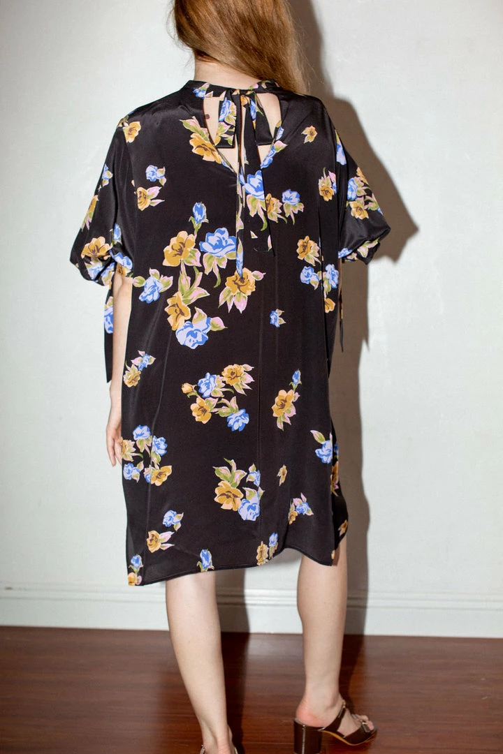 - Loosely cut shift dress in crinkled floral patterned silk. Puffed sleeve with tie. Tie detail at back of neckline.