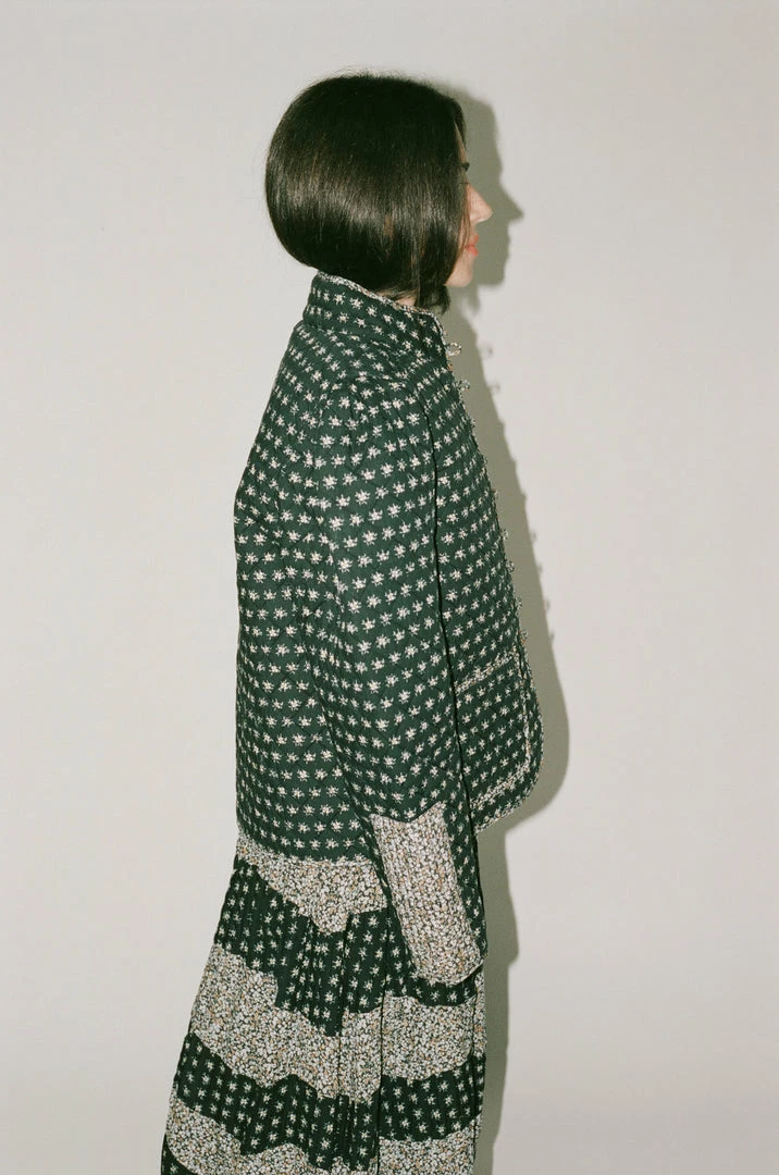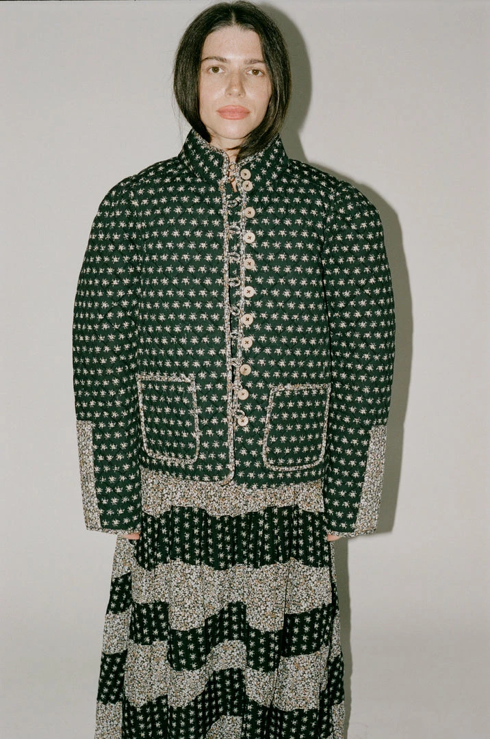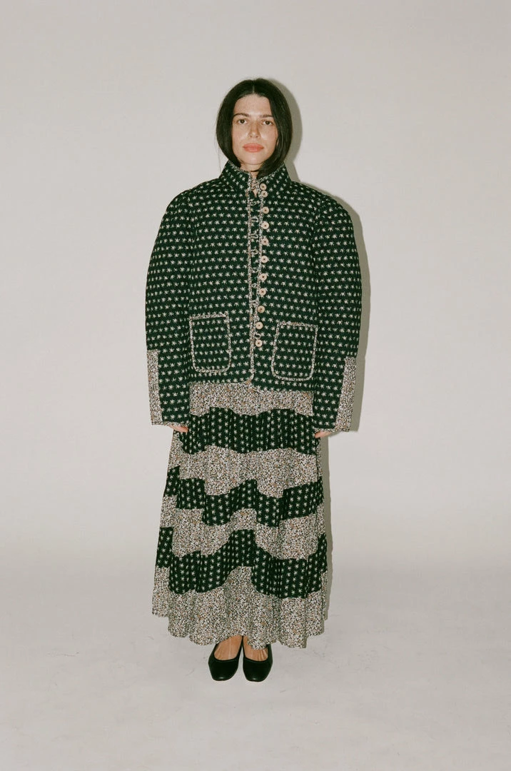 - The Pascala floral print quilted jacketΒ features long puff sleeves, contrast trim detailing and high collar.