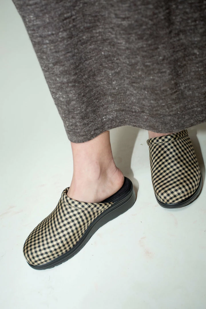 - Fabric clog with rubber wedge and padded soft anatomic insole