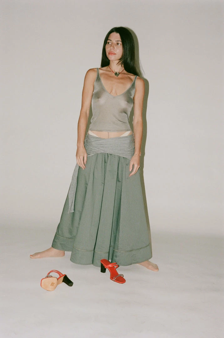 - SlightlyΒ sheer knit tank with V neck detail at the front and back.Β Cropped fit.