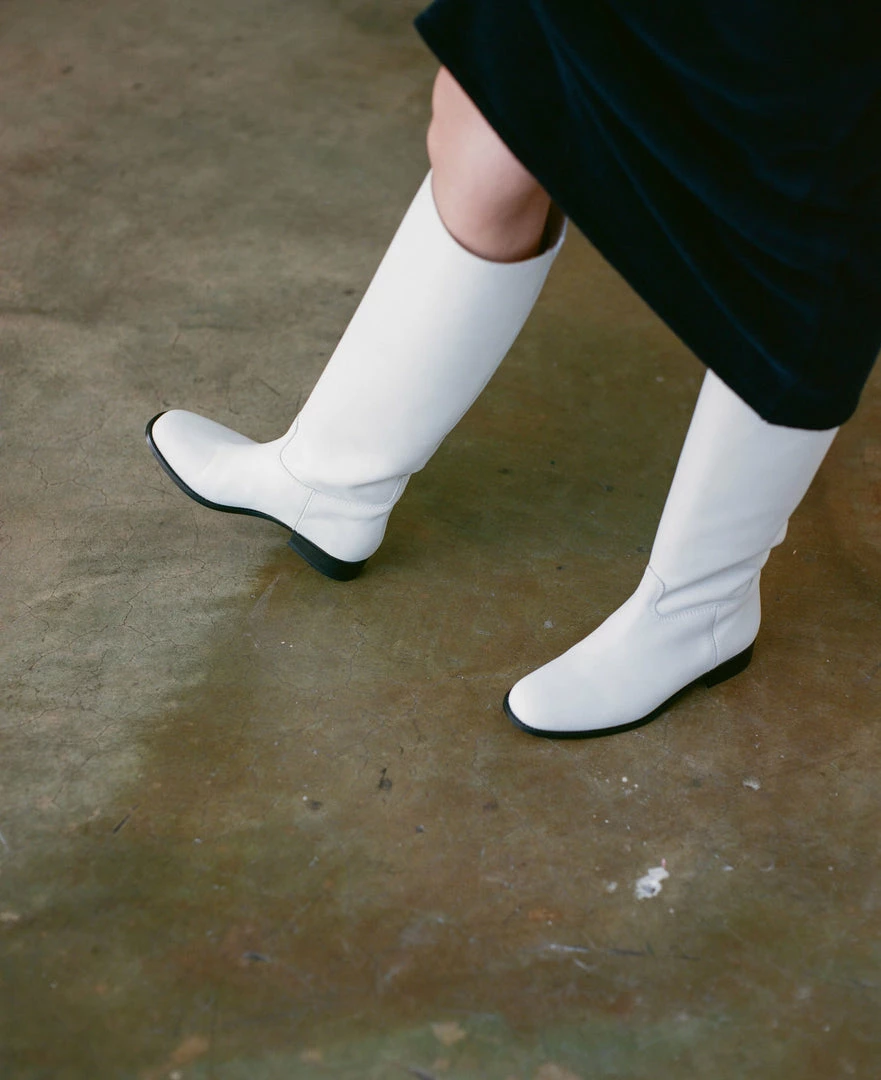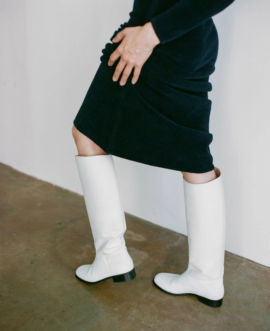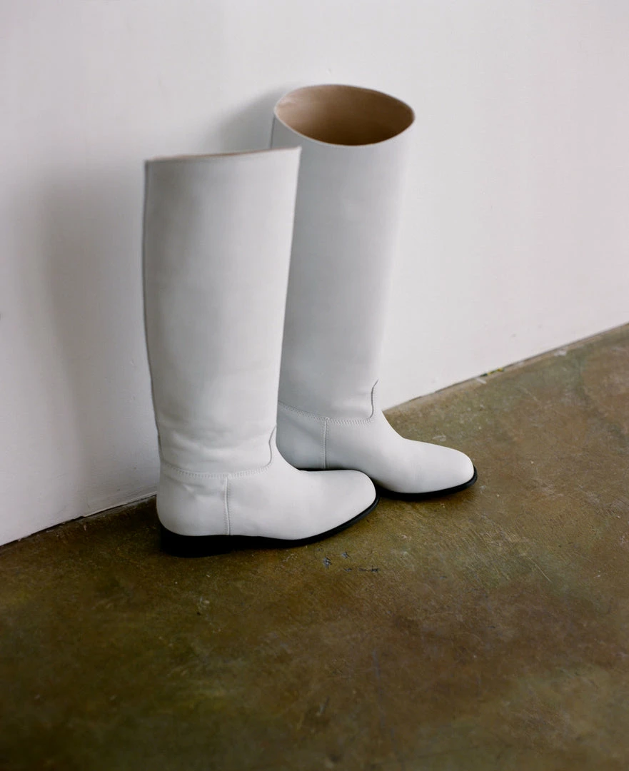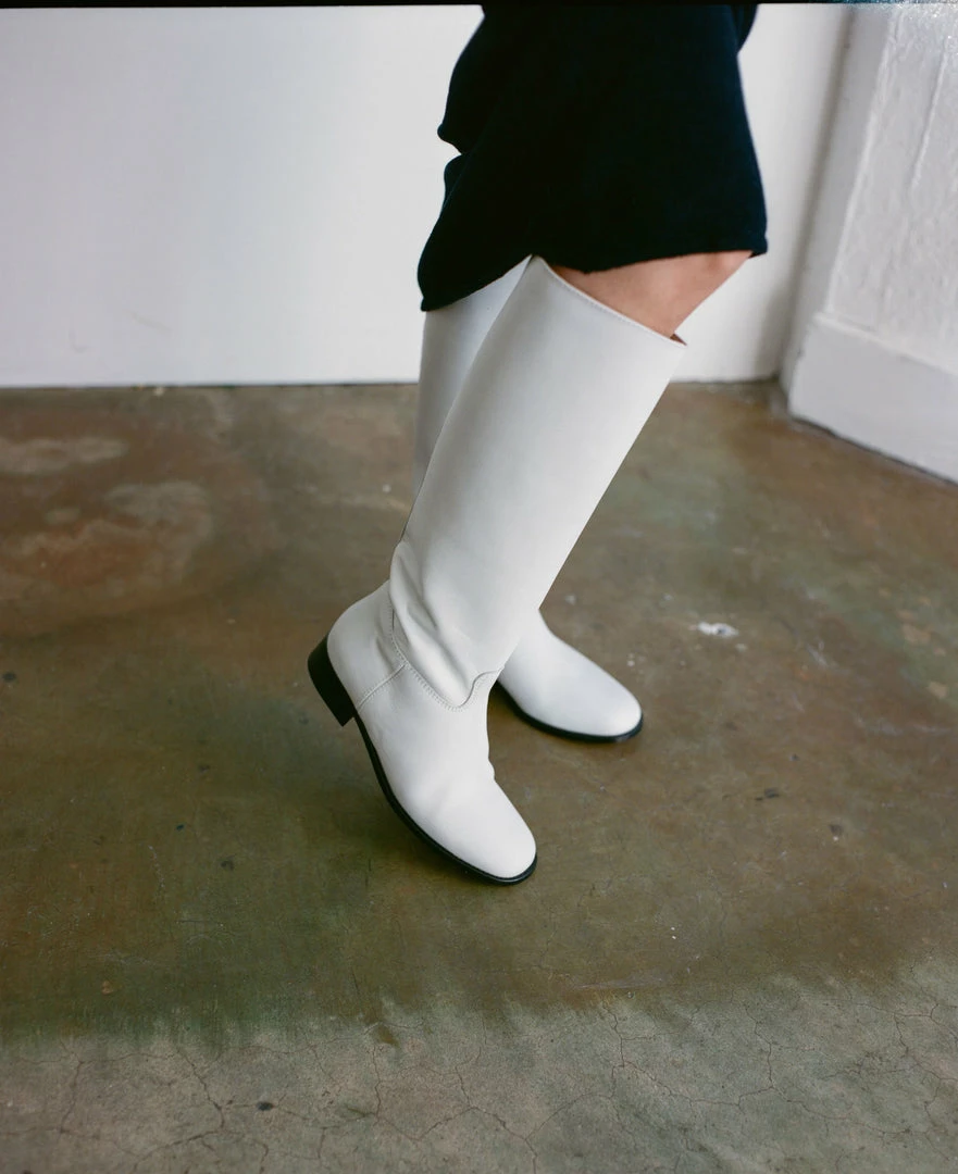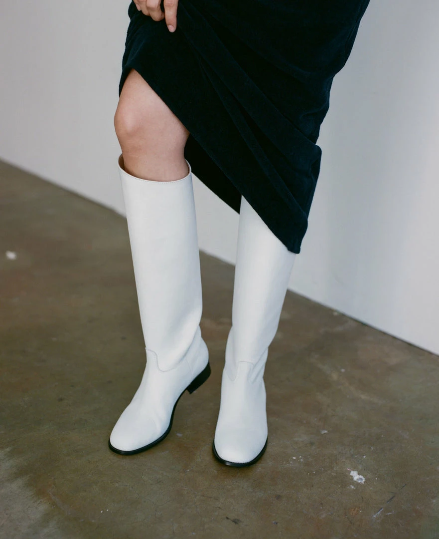 - A knee-high riding boot with rounded toe. Asymmetrical opening.Β 3cm heel height.Β Runs small. We suggest taking a full size up.