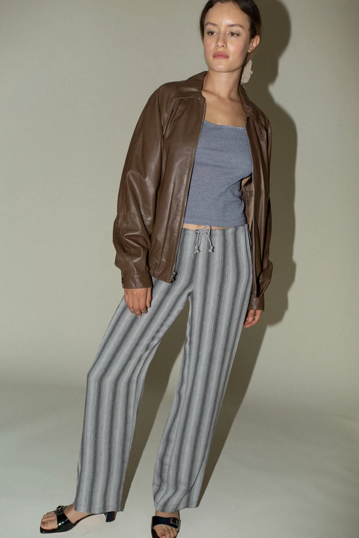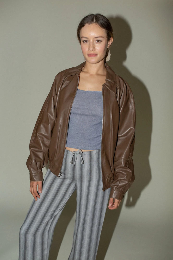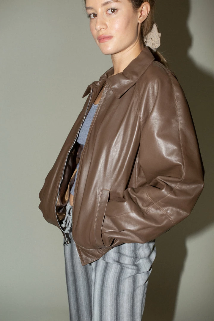 - Leather bomber jacket with zip front closure. Side welt pockets. Relaxed fit.