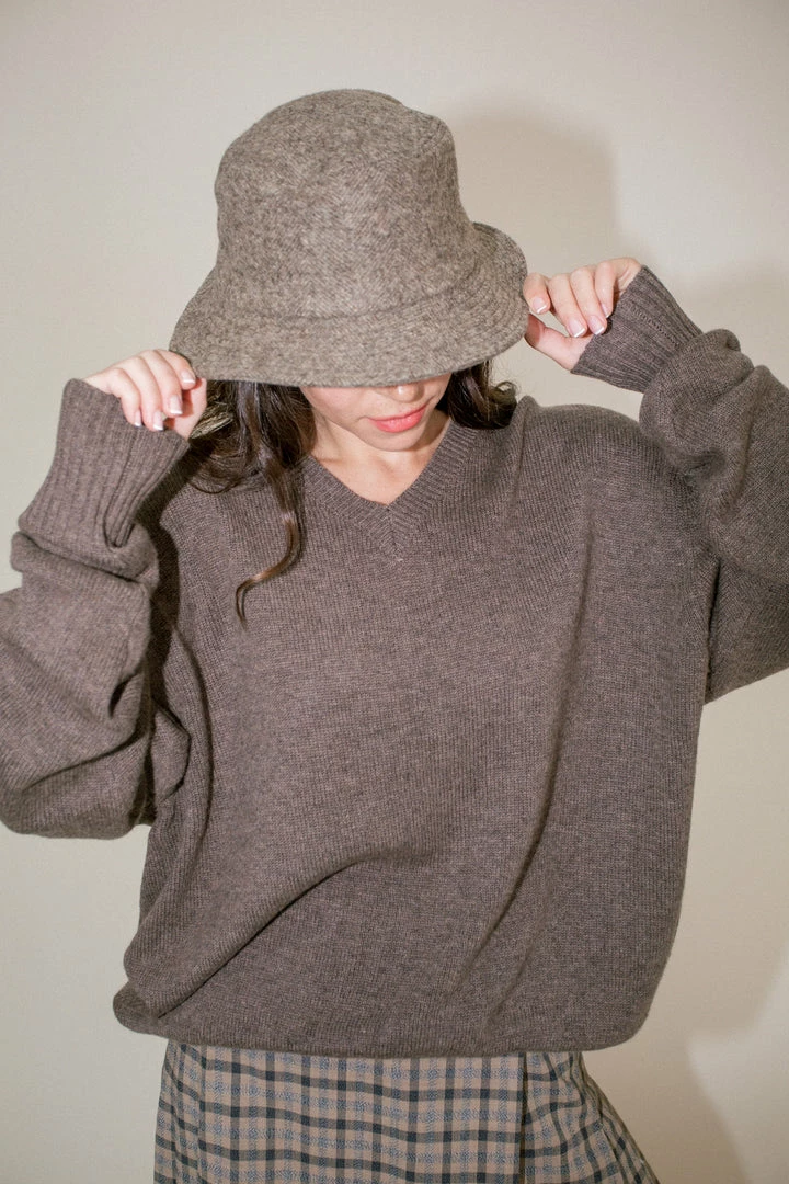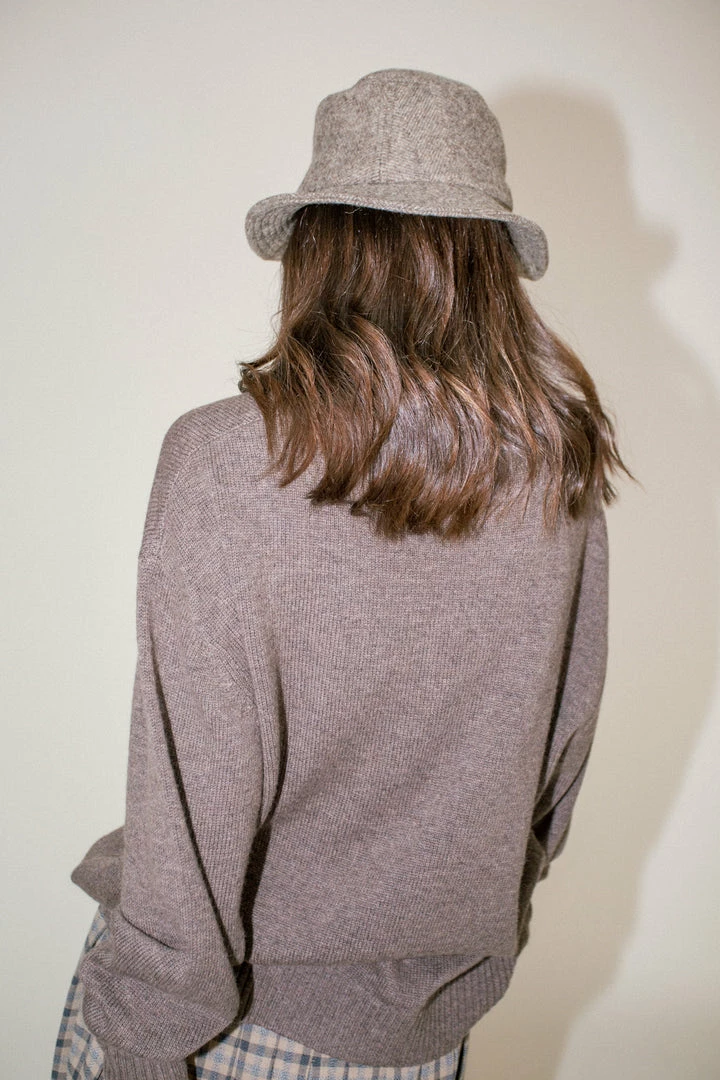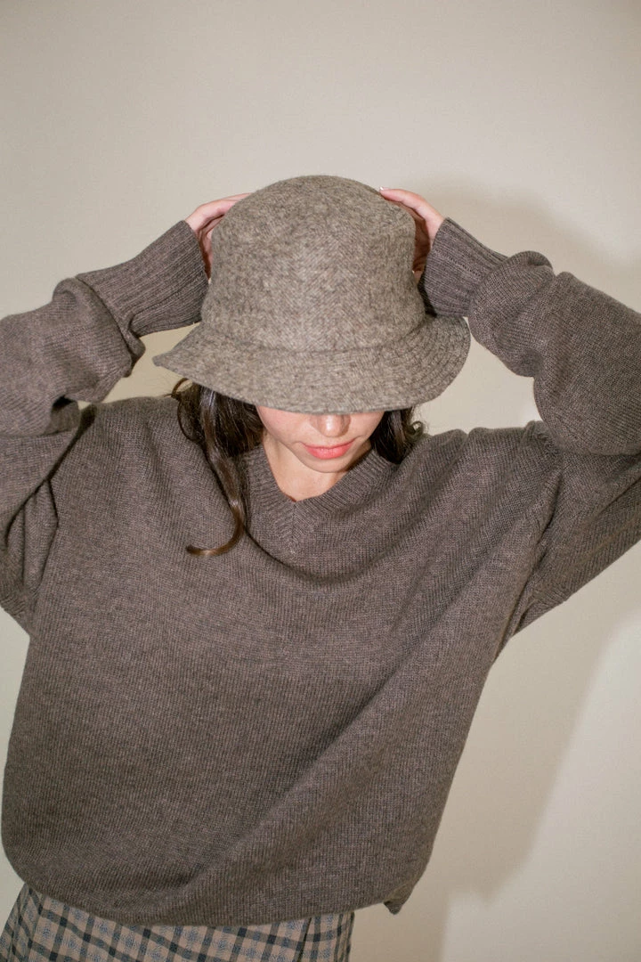 - Wool tweed bucket hat featuring tonal herringbone pattern. Quilted brim. Grosgrain trim at lined interior. Approx. 2.25″ brim.