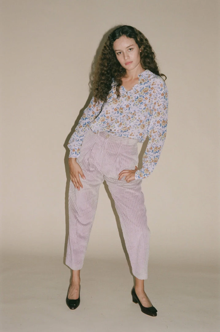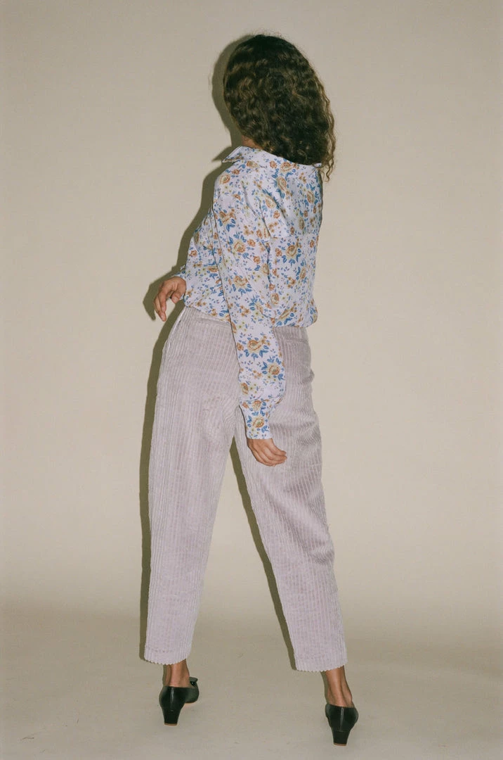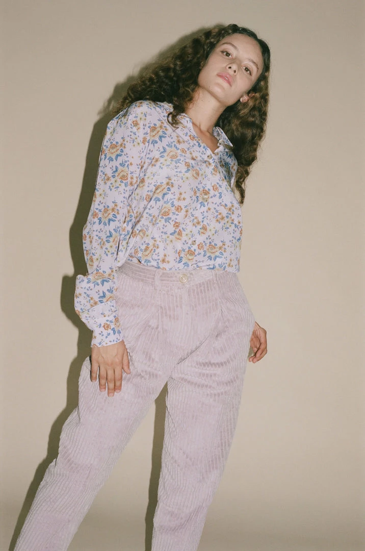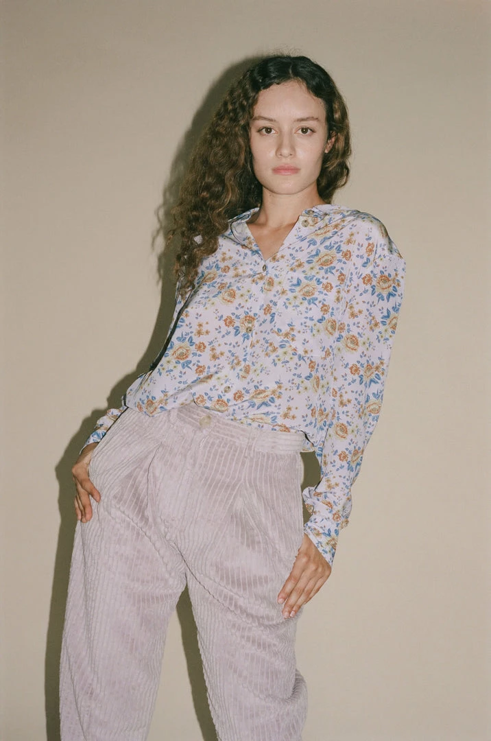 - Collared button-down shirt in floral printed silk. Single pocket at chest. Relaxed, slightly androgynous fit.
