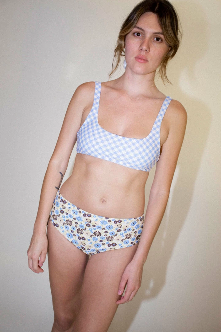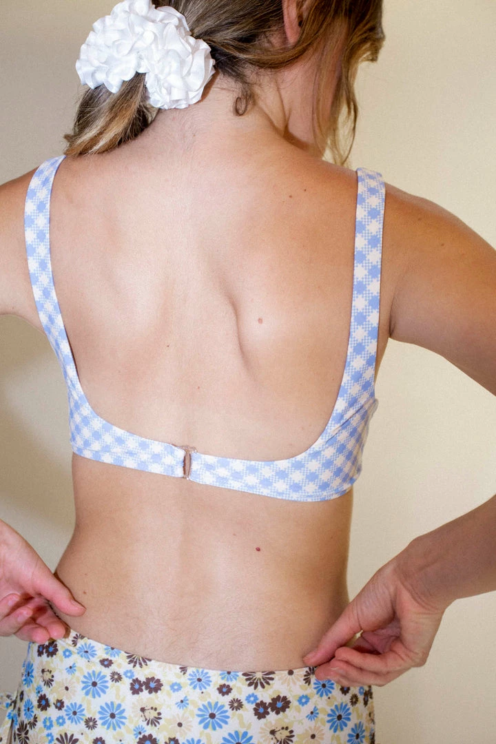 Sporty gingham printed bikini top with thick supportive straps. Moderate coverage. Fully lined. Mix and match with your favorite No.6 swim bottoms.