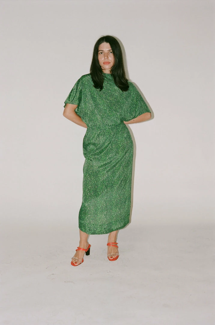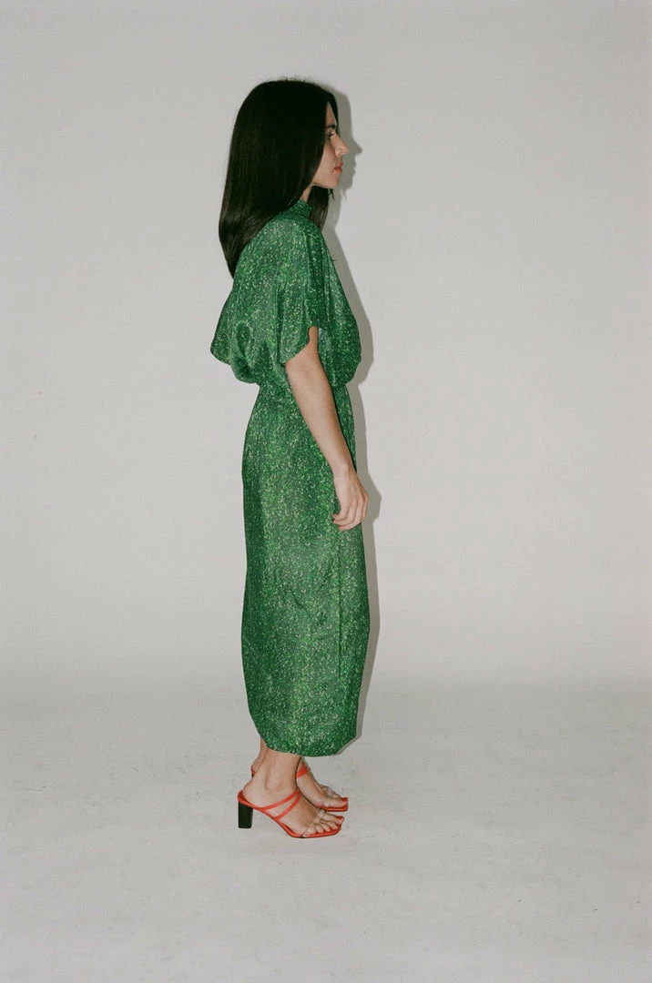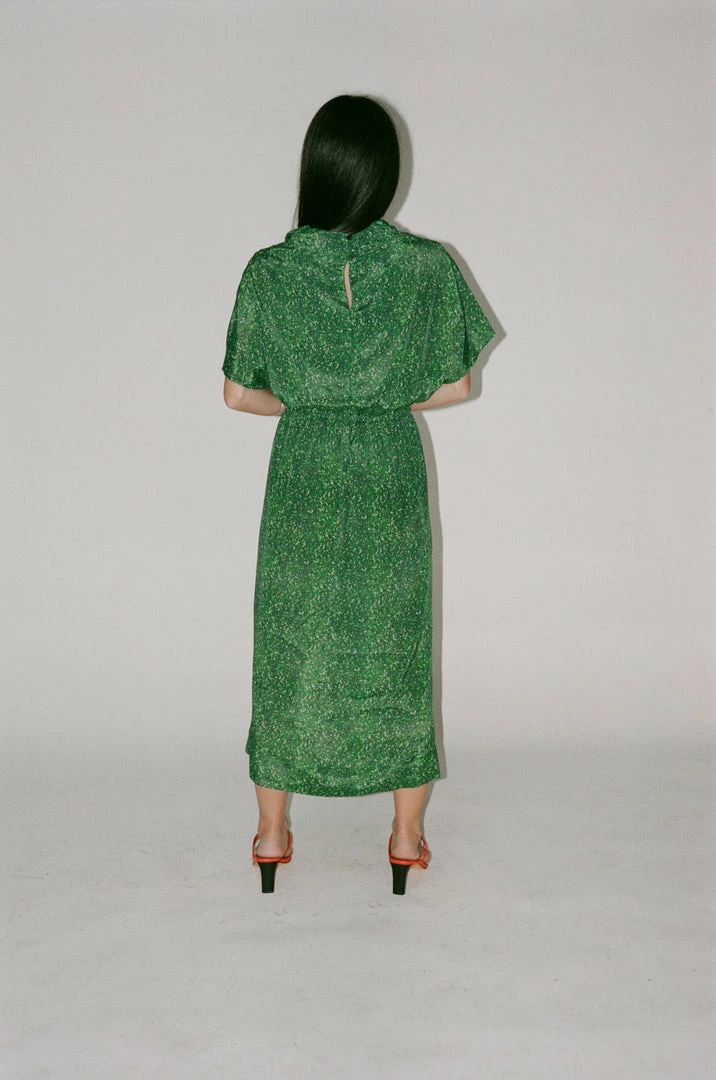 - Timeless throw on and go printed dress in a buttery soft printed silk CDC blend. Wide, cropped sleeves. Mock neck with keyhole opening at back. Elastic waistband adds shape without sacrificing elegance. Looks great styled casually or dressed up with heels and jewels. Made in New York City.