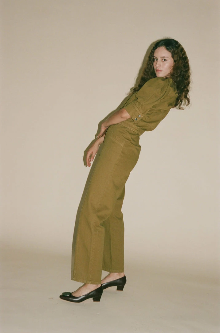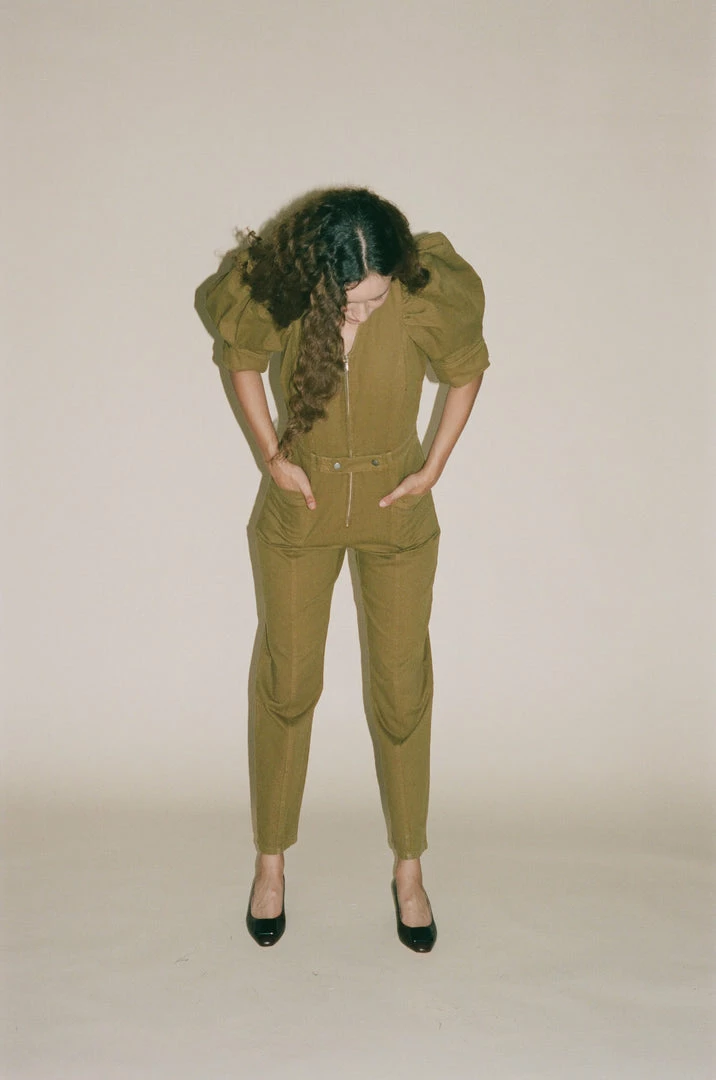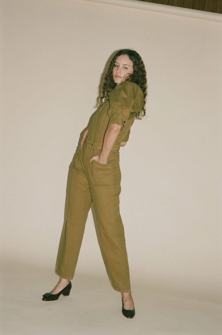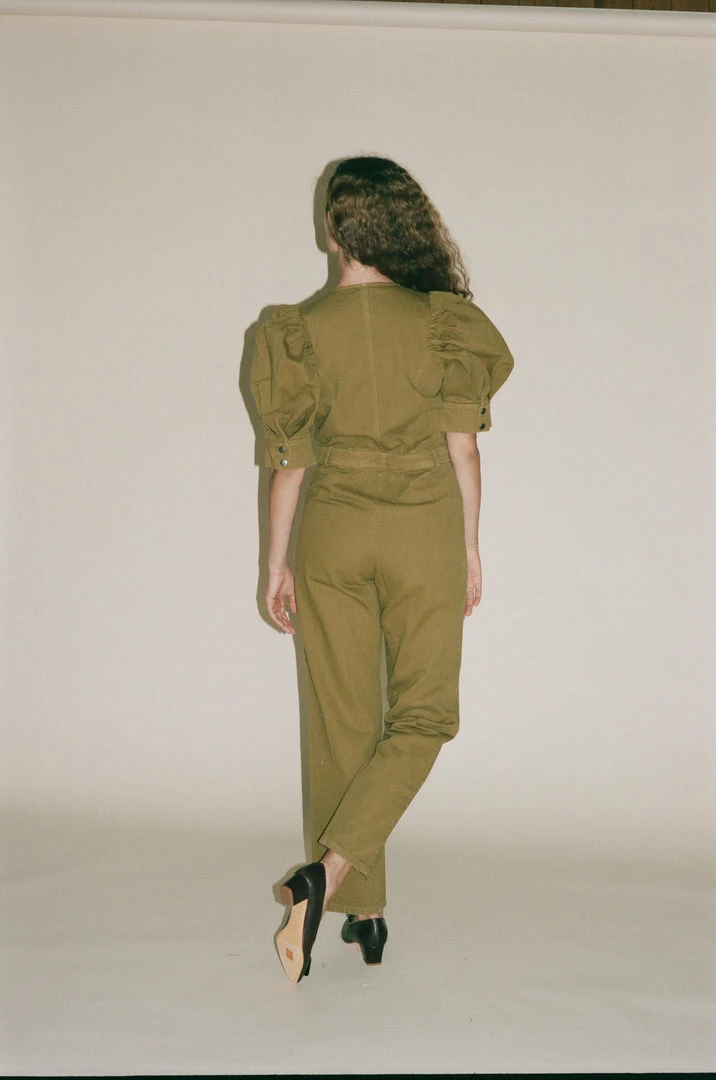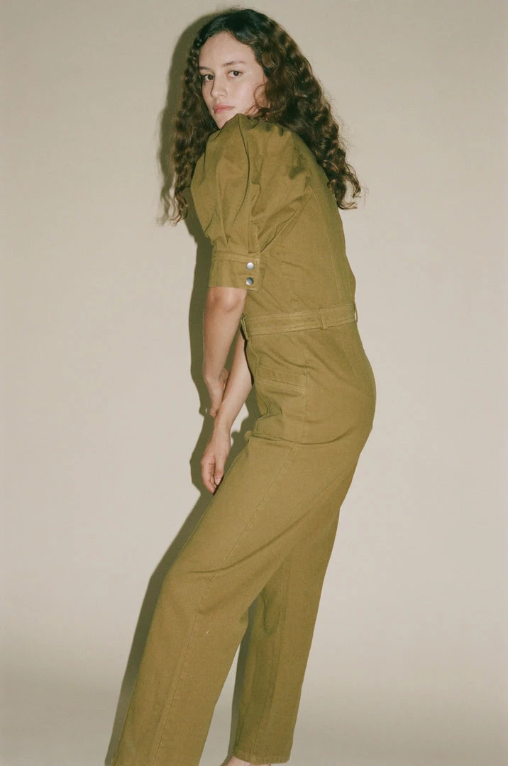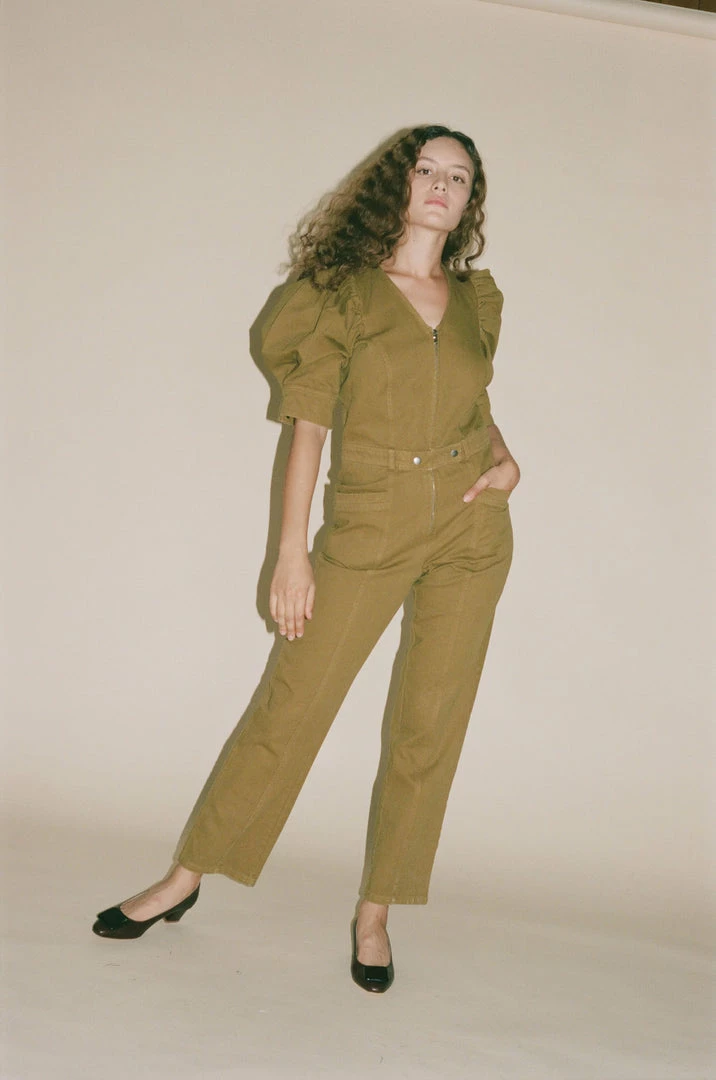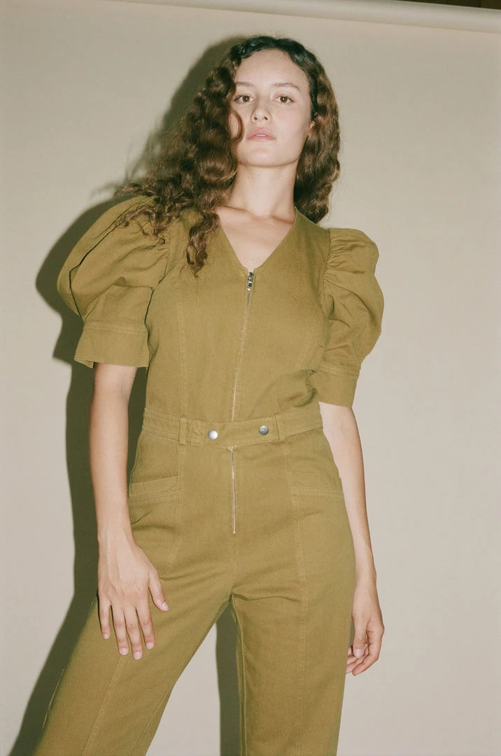 - The Metta acid wash jumpsuit features puff sleeves, v-neckline and exposed front zipper.