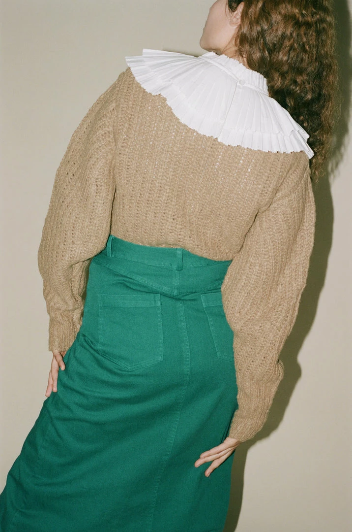 - The Octavia v-neck sweater features an oversized double pleated collar that is removable.