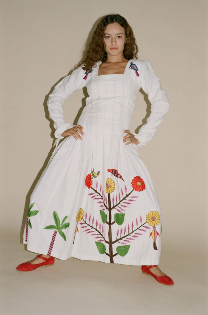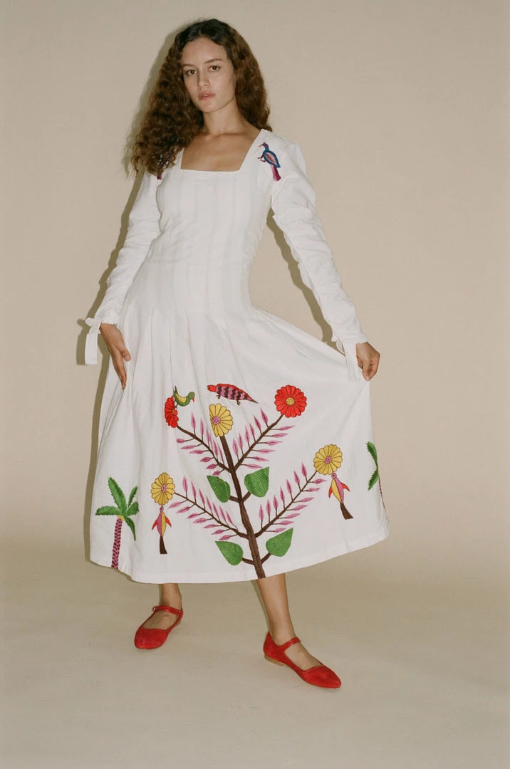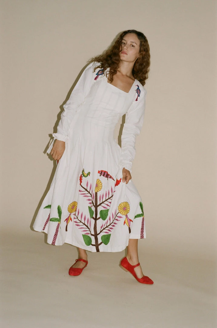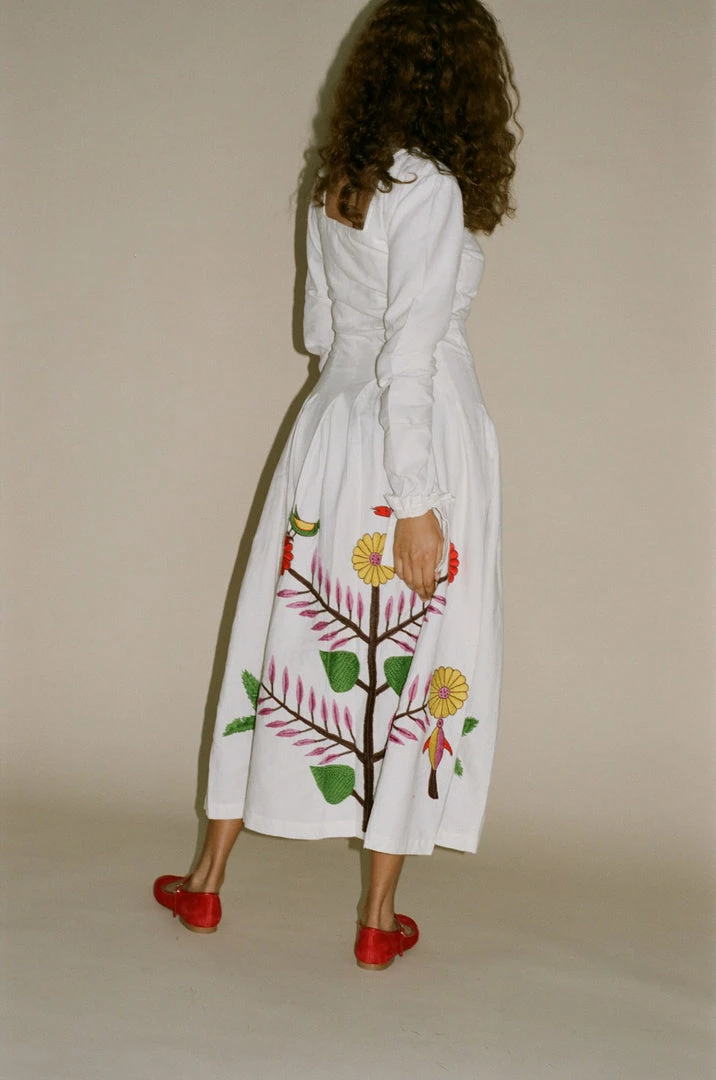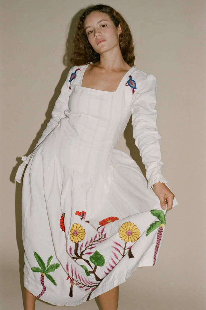 Tigra Tigra Hand-Embroidered Tropical Kantha Dress in White